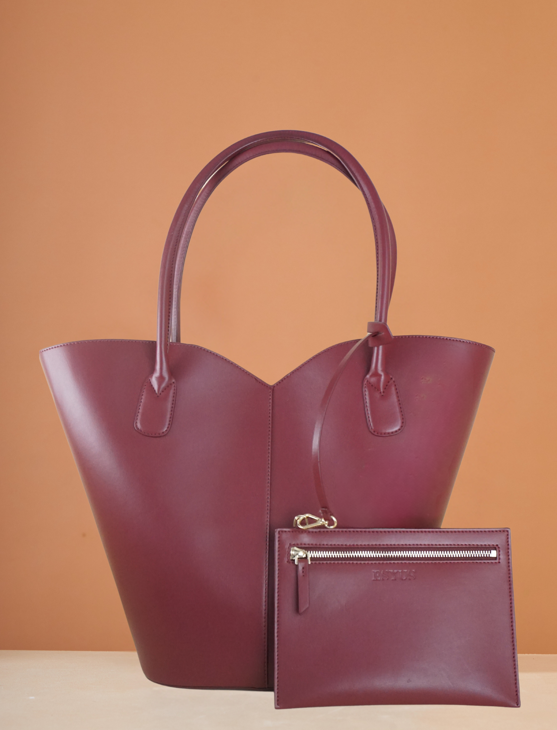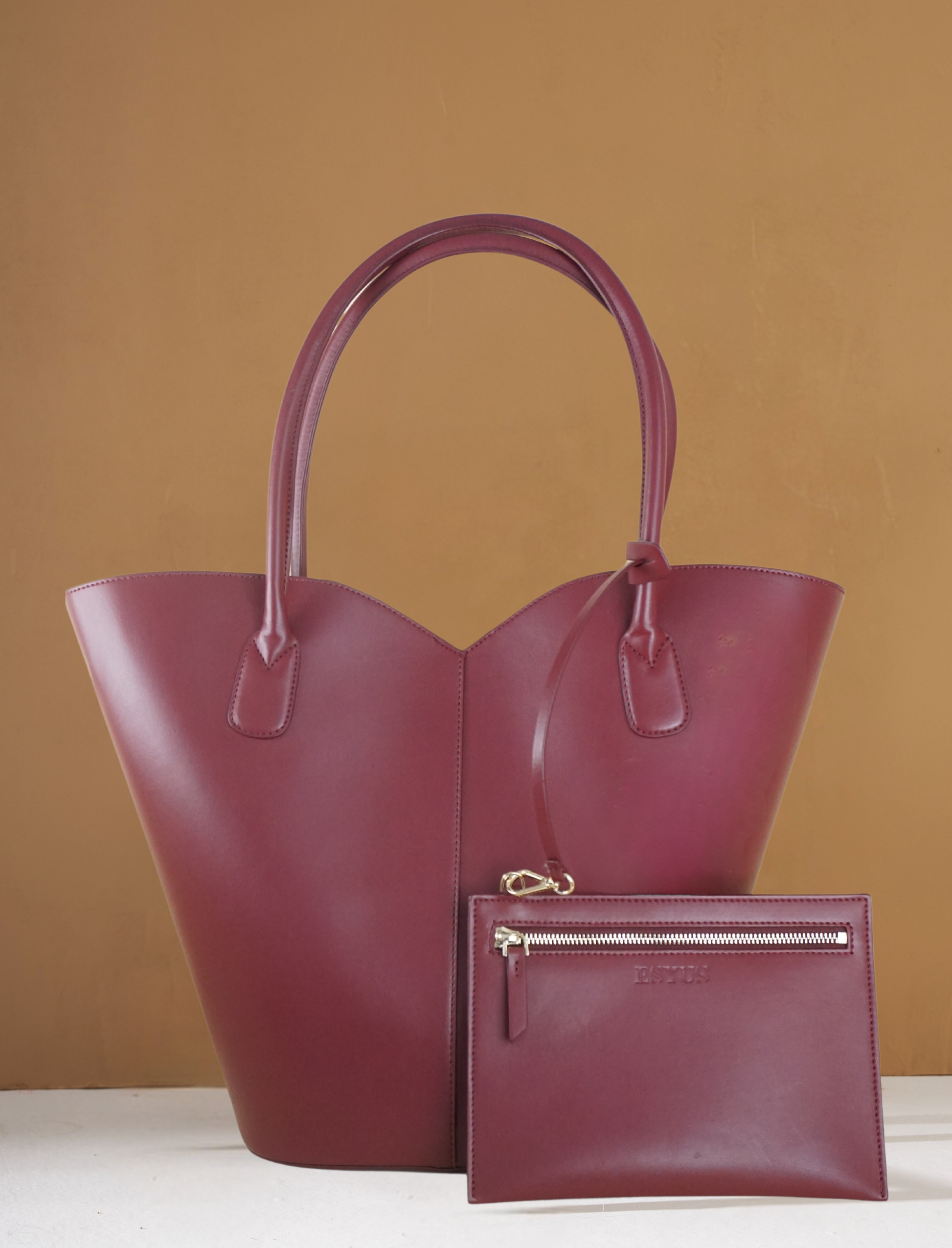 "The Merlot Grande" is imbued with a deep burgundy red, symbolizing a blend of luxury and depth. This sophisticated tote bag is crafted from high-quality apple leather, offering an eco-friendly choice for the style-conscious. A practical internal zip pocket ensures your essentials are always secure and organized.