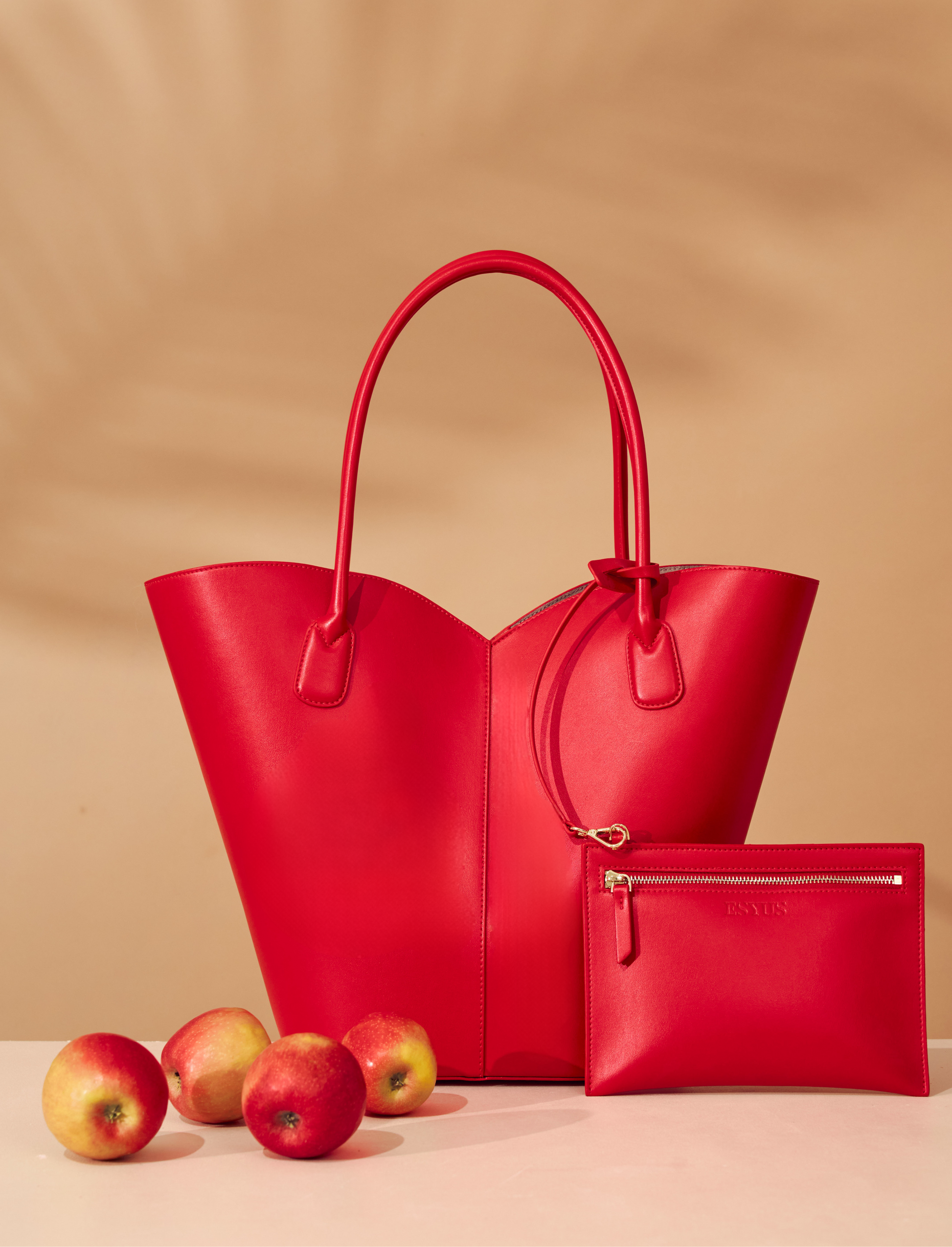 The Scarlet Grande stands out with its vivid red color, making it a striking choice for those who want to make a statement. This tote bag is crafted from luxurious apple leather and features a practical interior layout with an additional zip pocket for enhanced organization.
